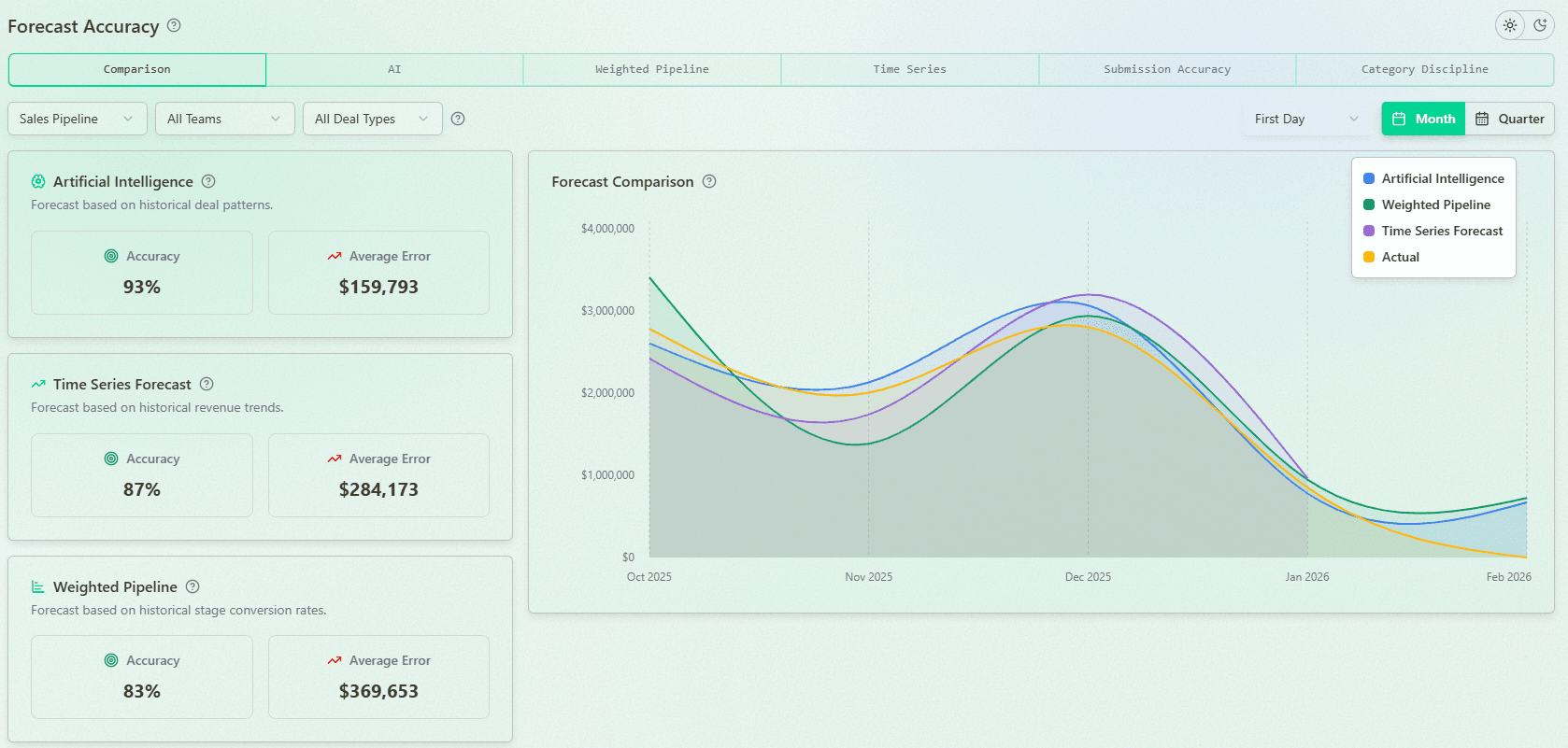Sales leaders can now see beyond pipeline values to understand how their forecasts match historical performance patterns. This gives them more confidence in their future revenue and take action early when forecasts show performance gaps.