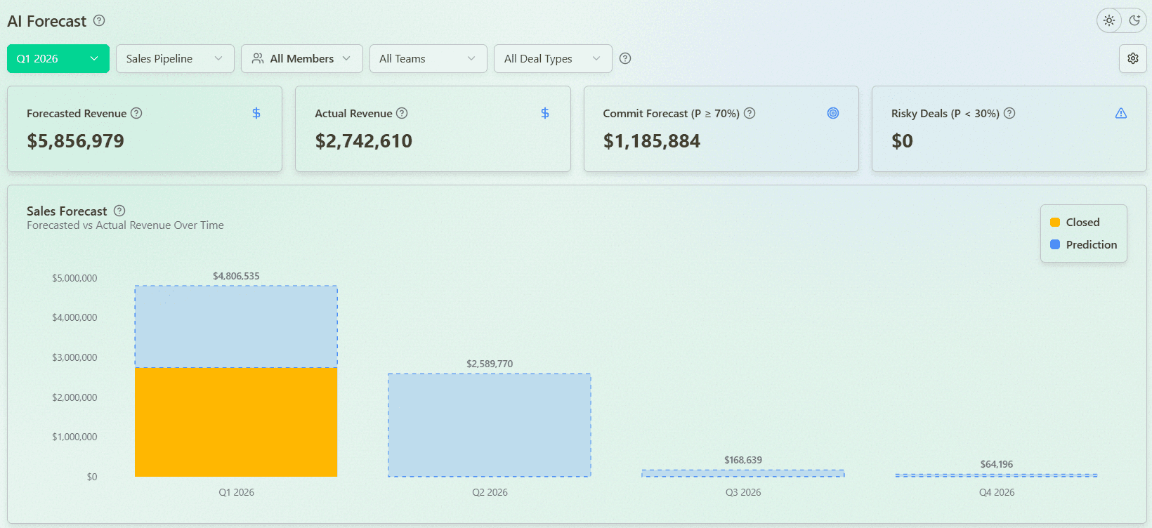 Modern sales forecasting technology has moved beyond simple pipeline calculations. Today’s platforms combine artificial intelligence, machine learning, and deep analytics to give you unprecedented insight into future performance.